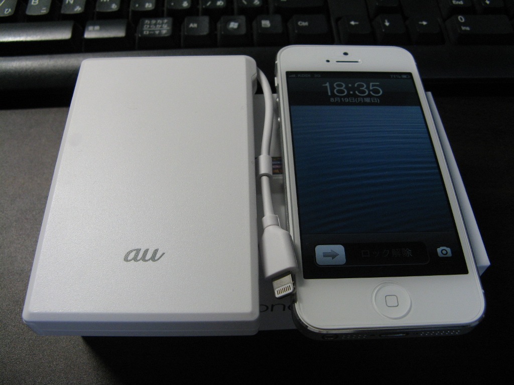 よくスマホを使っている人は「電池が~」「バッテリーが~」なんてよく言っている。で、店員に言われるままau純正の外部バッテリーを購入。