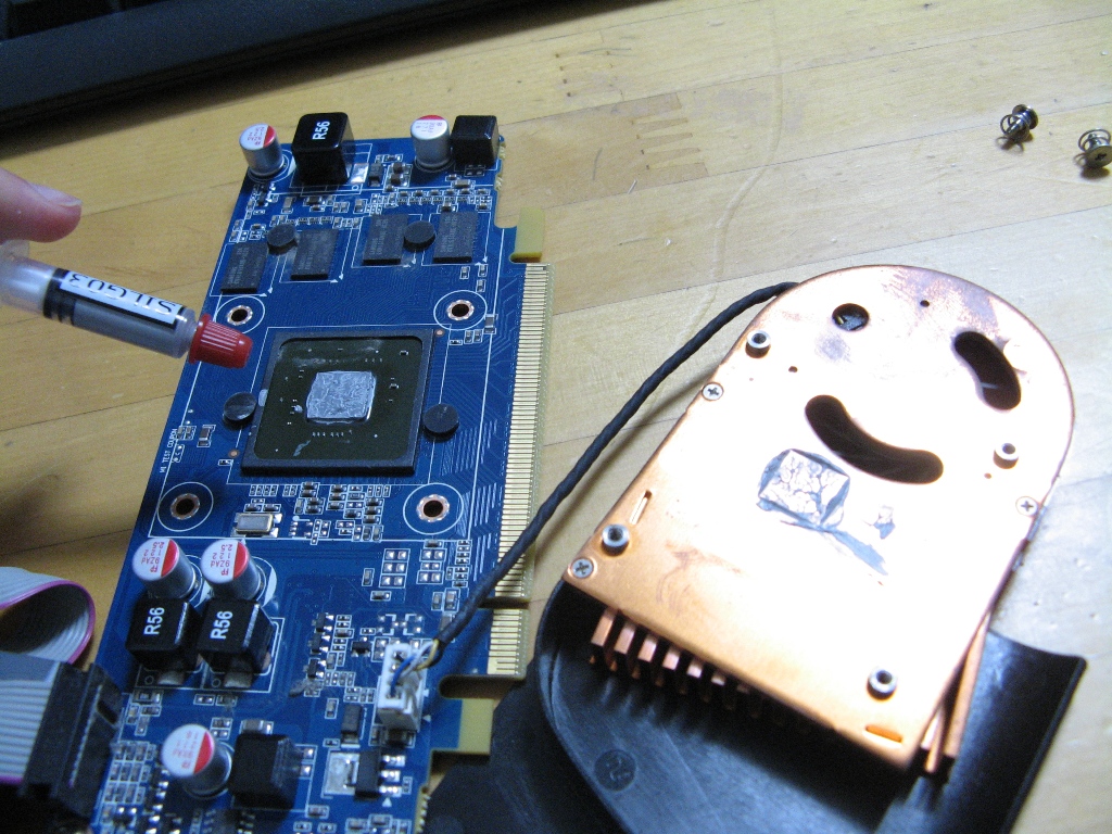 ↑↑この4つのねじを外す。 ↑↑ 持っているのがCPU用グリス。GPUにも使える。
